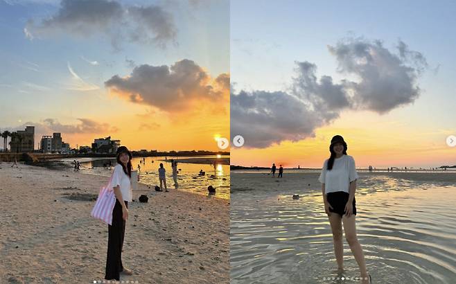 이어 "방학이 끝나는게 아쉬워서 해질무렵 나가본 바다…20분만 달려와도 이렇게 이쁜데 말이죠"라며 "여행자들은 예쁜 것도 준비물도 많이 챙기겠지만 도민인 우리들은 쿨하게 노파라솔 노수영복으로 바지 걷어붙이고 물고기좀 쫓아다니다 냉장고에서 집어들고간 냉차 마시고 과일좀 씹다 해지는거 보고 집에 왔어요(중딩언니는 누워있는게 힐링이라며 먹태만 뿌시고옴)"이라고 가족들이 각자 즐긴 여유를 설명했다.