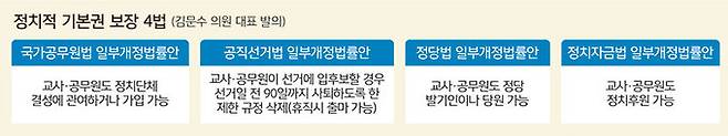 교사의 정치적 기본권을 보장하는 법안은 과거 수차례 발의된 바 있다. 이번 국회에서도 더불어민주당 김문수 의원이 교사·공무원이 지위를 이용하지 않는 선에서 국민으로서의 정치권 권리를 행사하도록 보장하는 ‘교사·공무원 정치적 기본권 보장 4법(국가공무원법 일부개정법률안, 공직선거법 일부개정법률안, 정당법일부개정법률안, 정치자금법일부개정법률안)’을 대표 발의했다. 법안이 통과될 경우 교사는 선거운동, 정당가입, 정당·정치인 후원 등이 가능해진다. 김 의원은 “현행법은 직무와 관계없는 정치적 표현까지 광범위하게 제약해 국민으로서 누려야 할 기본적 권리를 침해한다”고 강조했다.