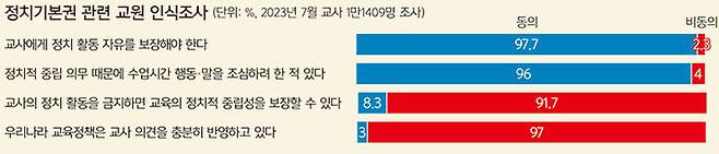 또 다른 학부모도 “현재 제약이 일종의 ‘브레이크’ 역할을 해주는 것 같다”며 “SNS 활동 등에 제한이 없으면 수업시간에도 지금보다 더 편하게 정치 이야기를 할 것 같아 걱정”이라고 말했다. 지난해 한국노총 중앙연구원의 조사에서도 학부모(2186명 조사) 2명 중 1명(46.7%)은 ‘교사의 정치 기본권이 제한되지 않으면 정치 편향적인 교육을 할 것 같다’고 답했다.