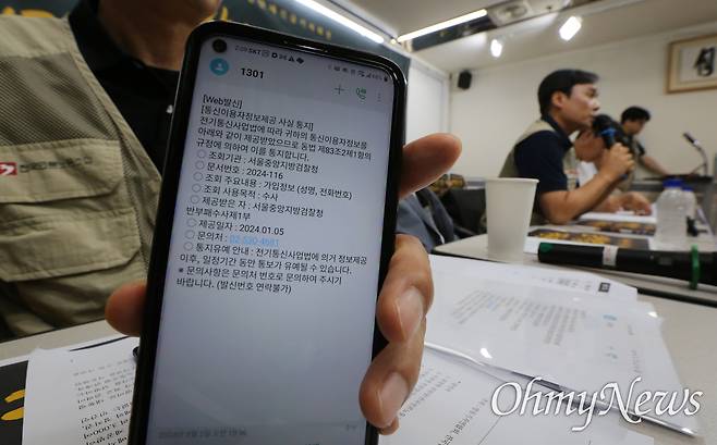| ▲ 방송기자연합회, 전국언론노동조합, 한국기자협회, 한국방송기술인연합회, 한국영상기자협회, 한국PD연합회 주최로 5일 오후 서울 중구 언론노조 사무실에서 열린 '검찰의 무차별적 통신 이용자 조회 규탄 언론현업단체 긴급 기자회견'에서 이은용 언론노조 민주언론실천위원장이 통보받은 통신 정보 조회 사실 문자메시지를 보여주고 있다. |