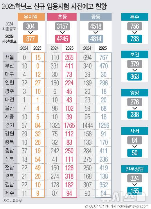 7일 교육부가 전국 17개 시도교육청이 이날 각각 공고한 '2025학년도 공립 신규교사 임용후보자 선정경쟁시험 선발 규모 사전예고 현황'을 취합한 결과다.
