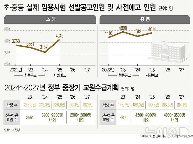 교육부는 지난해 관계부처와 협의해 '2024~2027 중장기 교원수급계획'을 마련, 2023학년도 3561명이던 초등교사 채용 규모를 오는 2027학년도에 2600~2900명 내외로 최대 26.9% 줄이겠다고 밝힌 바 있다.