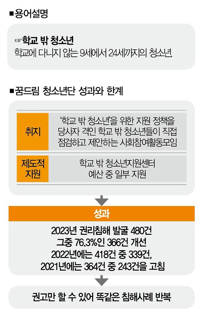 주목할 만한 성과도 내고 있다. 꿈드림 청소년단은 지난해 480건의 권리침해 사례를 발굴해 그중 76.3%인 366건을 개선했다. 2022년에는 418건 중 339건, 2021년에는 364건 중 243건을 고쳤다.