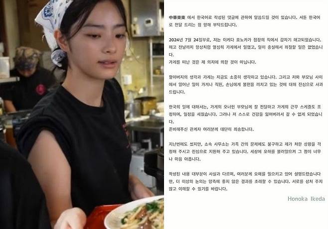 앞서 해당 논란은 이케다 호노카가 운영하던 중식당 중화동동에서 "지난달 24일부로 이케다 호노카가 중화동동을 떠나게 됐다. 호노카와 7월 24일부터 현재까지 연락이 완전히 끊겼다"라며 공지글을 게재하면서 불거졌다.