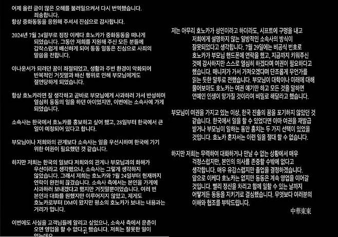 해당 게시글이 많은 화제를 모으면서 중화동동 측은 "어제 올린 글이 많은 오해를 불러 일으켰다"며 다시 한글로 번역한 공지글을 게재했다.