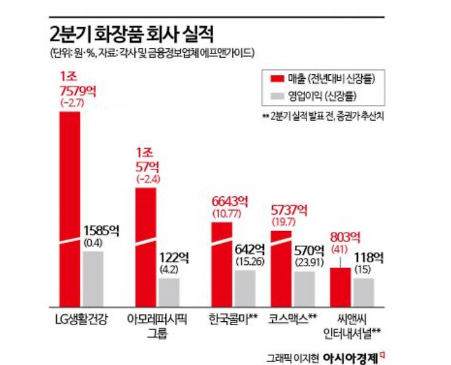 아모레퍼시픽의 경우 올해 2분기 매출액이 전년동기대비 2.4% 감소한 1조57억원을 기록했다. 다만 영업이익은 122억원을 기록, 4.2% 증가했다. 자회사인 이니스프리와 오설록이 마케팅 비용 효율화에 힘입어 각각 흑자전환과 250%대의 이익 성장을 기록한 덕분이다. 그러나 주요 계열사인 아모레퍼시픽은 매출액으로 9048억원을 기록해 전년대비 4.3% 줄었고, 영업이익도 30% 급감한 42억원을 기록했다. 시장에서 추정한 아모레퍼시픽의 매출액과 영업이익은 각각 1조152억원, 695억원이었다는 점을 고려하면 다소 부진했다는 평가다.