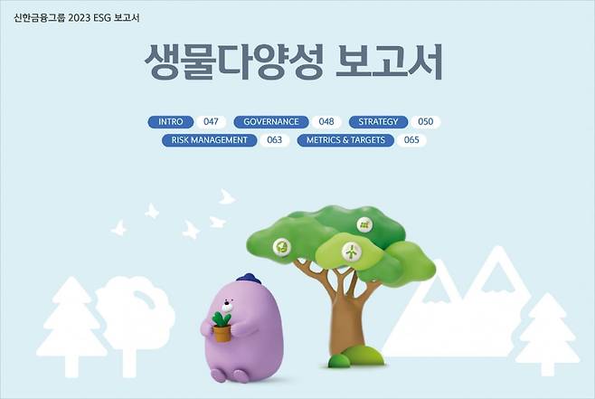 또 신한금융은 ‘훼손된 담수, 해양 및 육지 생태계의 최소 30% 복원·보장’, ‘생태계 기능 서비스 복구 유지 증진’ 등 글로벌 생물다양성 프레임워크에 기반한 23개 항목 중 신한금융과 관련해 13개 항목을 도출했다.