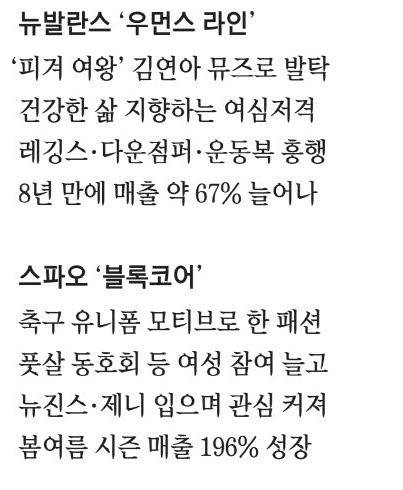 이랜드가 전개하는 패션 브랜드들이 요즘 젊은 여성의 관심사인 '헬시플레저'를 내세운 마케팅으로 승승장구하고 있다. 뉴발란스와 스파오가 대표적이다. 건강한 삶을 지향하는 여성들 마음을 사로잡고자 노력한 것이 매출로 이어지고 있다.