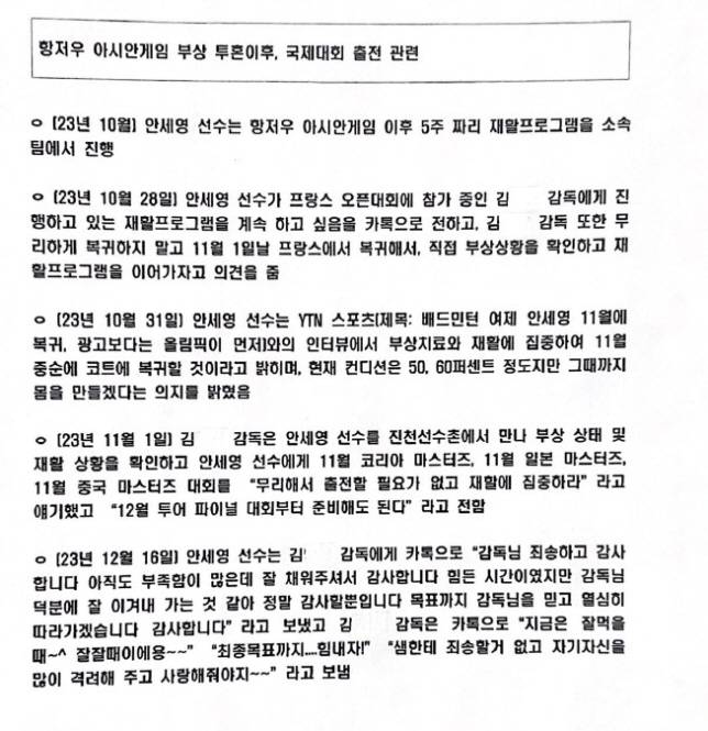 배드민턴 코치진은 6일 파리 출국을 앞두고 안세영의 치료 과정 및 재활 경과를 시간대별로 촘촘히 정리한 이 확인서를 협회와 대한체육회에 제출했다.