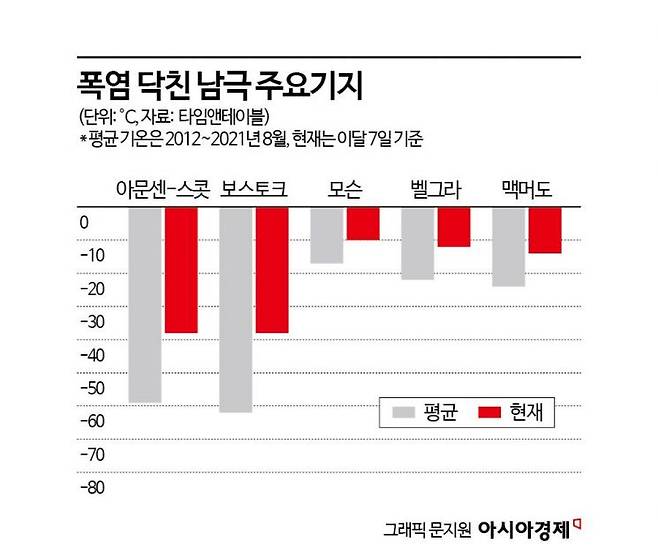 지구에서 가장 추운 장소로 꼽히는 보스토크 기지도 마찬가지다. 보스토크 기지는 러시아의 남극관측기지로 1983년 영하 89.2도를 관측해 역대 최저기온을 기록한 곳이다. 2012~2021년 8월 기준 보스토크 기지의 평균기온은 영하 62도였다. 더울 때도 영하 60도를 넘기지 않았다. 하지만 전날 기온은 영하 38~46도에 그쳤다. 보스토크 기지의 초여름 날씨와 비슷한 수준이다.