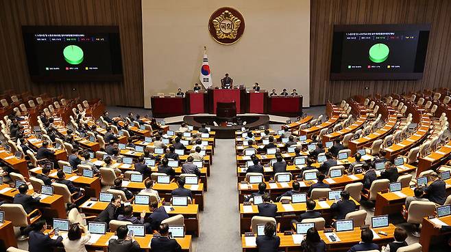 ▲ 지난 5일 본회의에서 야당 주도로 통과되고 있는 '노란봉투법'(노동조합·노동관계조정법 개정안)