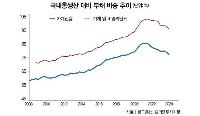 또한 업권별로 살펴보면 가계대출은 은행권에서만 증가하고 제2금융권에서는 급격히 줄어드는 양상을 보인다. 제2금융권 가계대출은 2022년 6조 원, 2023년 27조 원이 감소한 데 이어 올해 상반기에도 12조8000억 원이나 줄어들었다. 제2금융권 대출금리가 은행보다 훨씬 높다는 점을 감안하면 신용도가 상대적으로 떨어지는 가계의 대출이 더 많이 줄어든 셈이다.