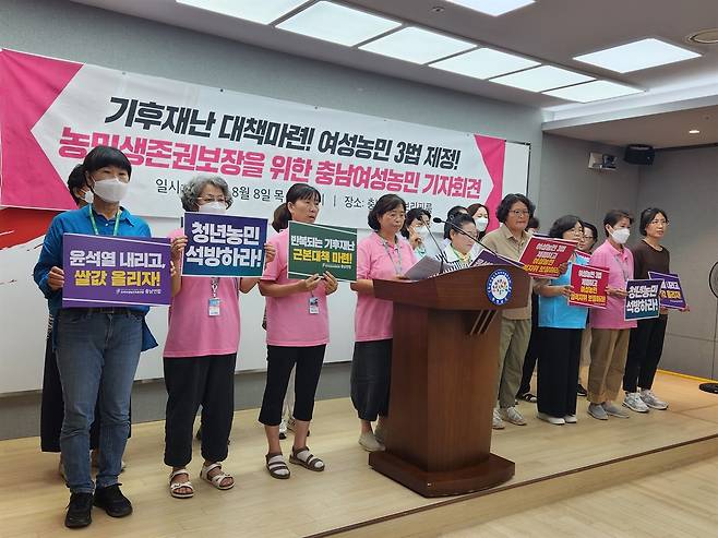| ▲ 8일 충남지역 여성농민들이 충남도청에서 기자회견을 열고 있다. |
