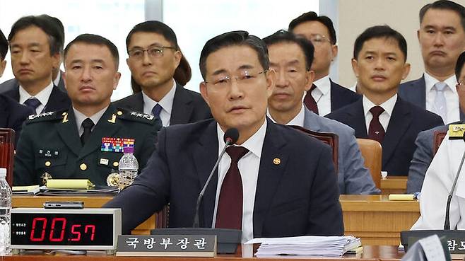 ▲ 8일 오전 열린 국회 국방위원회 전체회의에서 신원식 국방부 장관이 의원질의에 답변하고 있다.