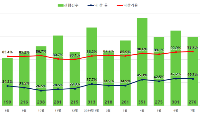 8일 지지옥션이 발표한 7월 경매동향보고서에 따르면 서울 아파트 낙찰가율은 전달(92.9%)에 비해 0.8%p 상승한 93.7%로 2022년 8월(93.7%) 이후 1년 11개월 만에 최고치를 기록했다.
