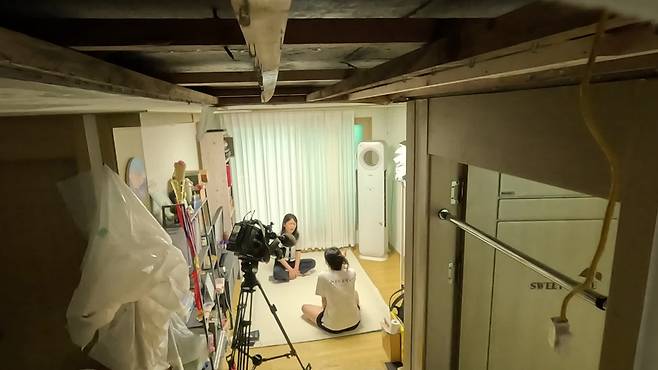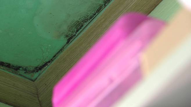 벽지에는 곰팡이가 잔뜩 피었고, 시멘트에는 물이 맺혀 있습니다. 임시로 설치한 '비닐 천막'도 지독한 곰팡냄새를 막아내기에는 역부족입니다.