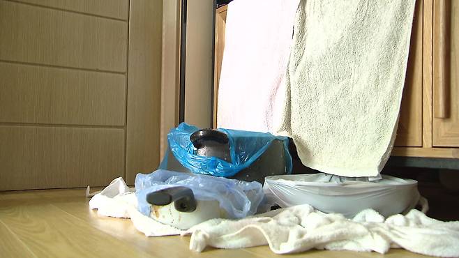 "비가 내리더니 갑자기 약간 뭐가 터지듯이 물이 주르륵 내리는 거예요. 주방부터 해서 싱크대부터 저기 식탁까지 주르륵 내리는데. 잠결에 놀랐죠. 계단에서는 물이 흘러내리고 있고. 우선 윗집에 밸브부터 잠가달라고 했어요."