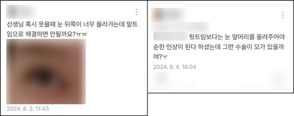 이런 내용으로, 눈꼬리 내리는 수술하지 마시라고 여러 번 설명드렸습니다. 그런데, '눈 앞머리를 올리는 수술'에 대해 구체적으로 설명드린 적이 없어서, 이에 대해 궁금해하시는 분들이 많은 것 같습니다. 제가 운영하는 블로그에서도 '눈꼬리를 내리고 싶은데 정말 하면 안 되는지', '눈 앞머리를 올릴 수 있는 수술은 무엇인지'에 대한 문의가 여전히 자주 들어오고 있습니다. 최근 며칠 동안에도 이런 질문들이 보였습니다.