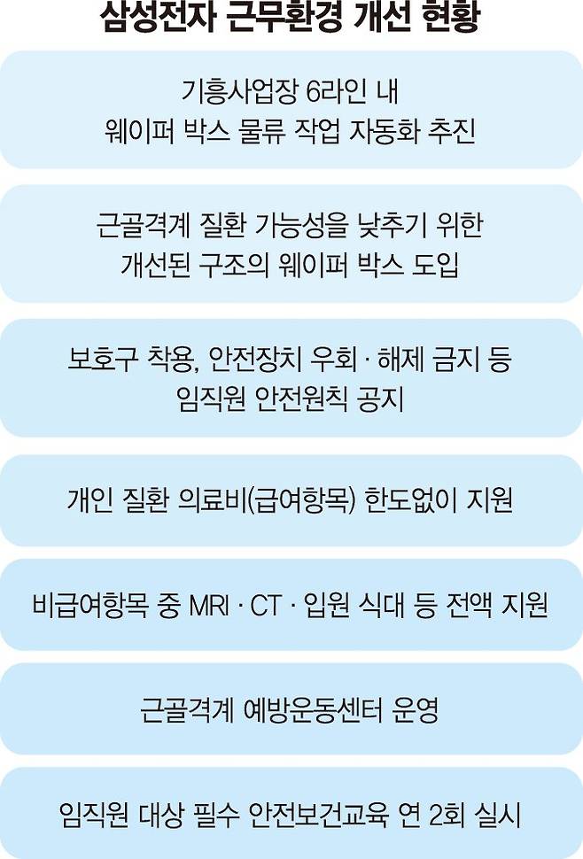 삼성전자가 10만명이 넘는 임직원들의 근골격계 질환 예방을 위해 물류 자동화 확대 등 다각적인 사업장 안전 강화 방안을 추진한다.