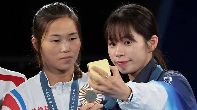 ▲ 파리올림픽 복싱 여자 54㎏급에서 동메달을 획득한 한국 임애지와 북한 방철미가 시상대에 올라 기념촬영을 하고 있다.