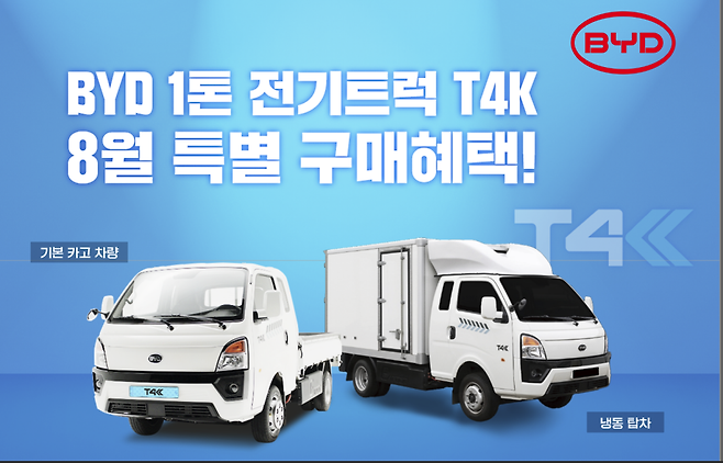 GS글로벌이 BYD 1톤 전기트럭 'T4K' 구매자를 위해 8월 프로모션을 진행한다고 9일 밝혔다.