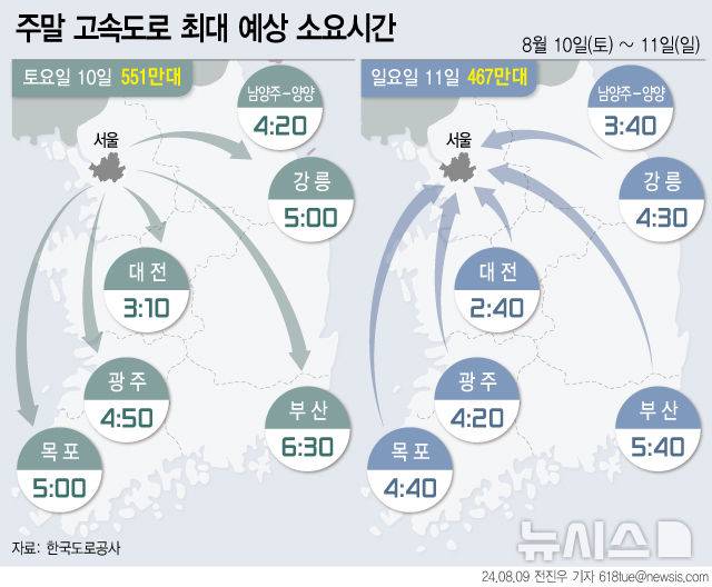 토요일 서울에서 지방 방향의 최대 예상 소요시간은 ▲서울-대전 3시간10분 ▲서울-부산 대동 6시간30분 ▲서울-광주 4시간50분 ▲서서울-목포 5시간 ▲서울-강릉 5시간 ▲남양주-양양 4시간20분 등이다.