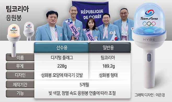 128년의 역사상 처음으로 올림픽에 K-팝 응원봉이 입성했다. 세계적인 그룹 방탄소년단(BTS), 세븐틴, 뉴진스가 소속, 응원봉 제작에 일가견이 있는 엔터테인먼트사 하이브가 2024 파리올림픽의 ‘팀코리아 응원봉’ 제작을 맡았다. 하이브는 앞서 지난 3월 대한체육회와 업무 협약을 맺고, 응원봉과 팀코리아 공식 머치를 제작하게 됐다.