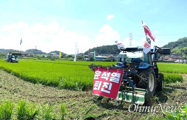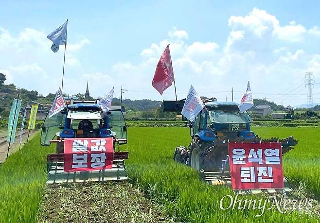 농민들은 트랙터에 '쌀값 보장', '윤석열 퇴진'이라고 쓴 펼침막을 붙였다. 이날 농민들이 갈아엎은 논은 1150평이다.