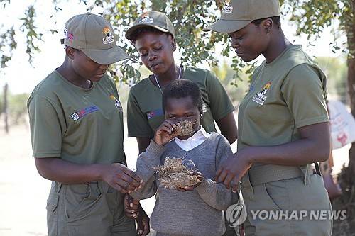 Esther Bote, 14, sniffs elephant dung as game rangers watch on the periphery of Save Valley Conservancy, Zimbabwe on Wednesday, July 10, 2024. The conservancy and the country's parks agency have been running a program for school-age children on how to recognize danger signs and how to coexist with wildlife. (AP Photo/Tsvangirayi Mukwazhi)