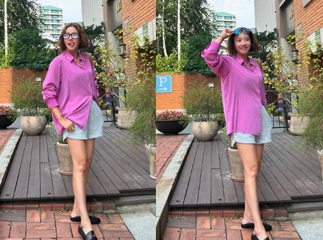 손담비는 사진 속에서 형광빛이 도는 분홍색 와이셔츠를 입고 있는데, 박시한 핏을 보여준다. 손담비는 셔츠에 회색 반바지를 매치했고, 검은색 구두로 멋을 더했다. 마지막으로 테가 두꺼운 안경까지 함께 착용했는데, 도회적인 분위기가 물씬 풍긴다.