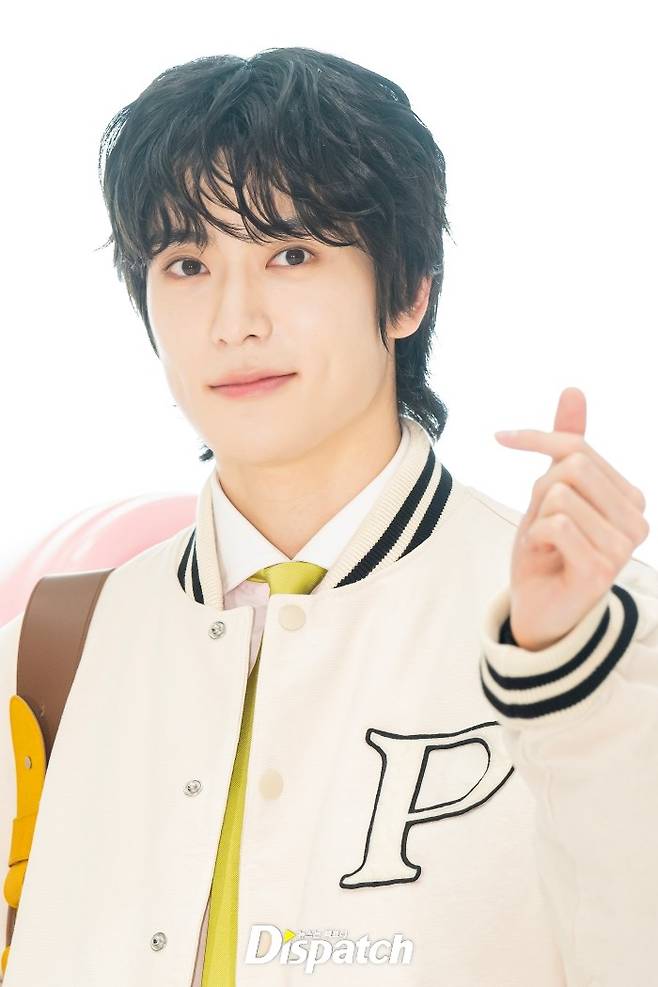 재현은 바시티 점퍼와 데님 팬츠로 멋을 냈다. 잘생긴 비주얼이 돋보였다.