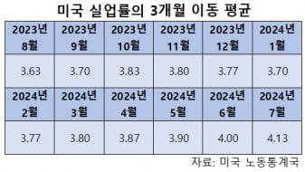 최근 외신이 삼의 법칙을 기사로 많이 다룬 건 이 지표가 말하는 경기 침체 요건이 충족된 차에 주가가 폭락했기 때문입니다. 미국 노동통계국은 지난 2일 "지난달 실업률이 4.3%로 집계됐다"고 발표했습니다. 이에 앞서 지난 5월과 6월 실업률이 각각 4.0%, 4.1%였기 때문에 최근 3개월(5~7월) 평균은 4.13%로 산출됩니다. 이런 식으로 최근 12개월 동안의 '매달 3개월 이동 평균 실업률'을 구해보면 지난해 8월 수치가 3.63%로 최저치입니다. 이 수치와 가장 최근 수치(4.13%) 간의 격차는 0.50%포인트로, 삼의 법칙이 정의한 경기 침체 요건에 맞아떨어집니다.