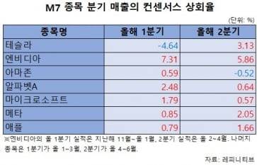 강 파트장의 설명대로 최근 빅테크의 실적이 시장의 기대에 못 미쳤을까요. 매출에 대해서는 그의 설명이 맞습니다. 최근 발표된 빅테크의 실적을 보면, 아마존 매출은 컨센서스(금융정보업체 레피니티브 집계)에 0.4% 미달했습니다. 구글, 마이크로소프트의 매출은 컨센서스를 각각 0.6% 상회하는 데 그쳐 '시장 기대치에 부합하는 수준'이었습니다. 시장이 내심 원했던 건 그게 아닌데 말이죠. 메타와 애플은 2분기 매출이 컨센서스를 각각 2.1%, 1.7% 웃돌아 다른 빅테크 대비 나은 모습을 보였습니다. 그 덕에 이들 종목은 나스닥지수가 고점을 찍은 지난달 10일부터 바닥을 찍은 이달 5일까지 각각 11.03%, 10.18% 떨어지는 데 그쳤습니다. 같은 기간 하락 폭이 15%를 넘은 다른 M7 종목(애플 제외) 대비 '비교적' 양호했죠.