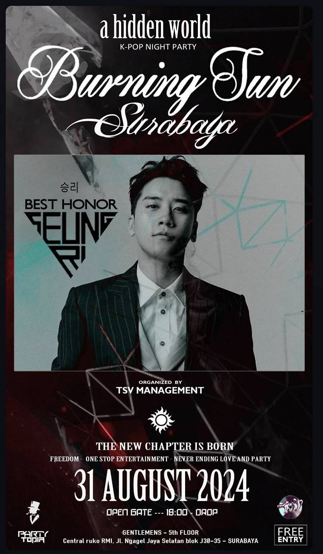 9일 미국 한류 전문 매체 올케이팝은 승리가 오는 31일 인도네시아 수라바야의 한 클럽에서 진행하는 '버닝썬 수라바야'라는 이벤트에 함께한다고 보도했다.