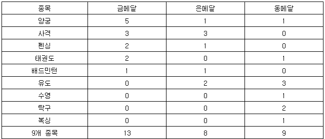 세계를 호령하는 우리나라 강세 종목을 재확인하고, 사격이 메달밭으로 돌아왔다는 점은 긍정적이나 메달 종목이 편중됐다는 사실은 아쉬움으로 남는다.