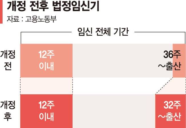 '임신기 근로시간 단축'은 임신 12주(임신 3개월) 이내 또는 36주 이후(임신 9개월)의 모든 여성 근로자가 임금을 동일하게 받으면서 근로시간을 하루 2시간 줄여 일할 수 있는 제도다. 하지만 임신 36주차에 접어들면 단축근로가 아닌 출산휴가를 가는 경우가 많고, 32주차부터는 조산 위험이 높아 개선을 요청하는 목소리가 많았다.