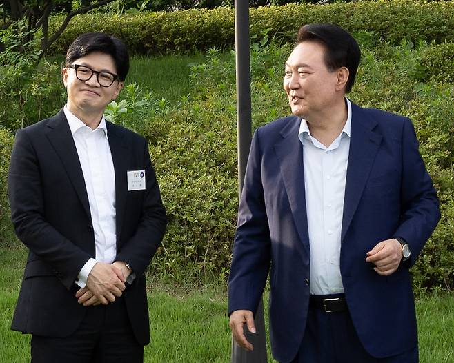 | ▲ 윤석열 대통령이 7월 24일 서울 용산 대통령실 앞 파인그라스에서 열린 국민의힘 신임 지도부 초청 만찬에서 국민의힘 한동훈 신임 대표와 함께 하고 있다. [대통령실 제공] |
