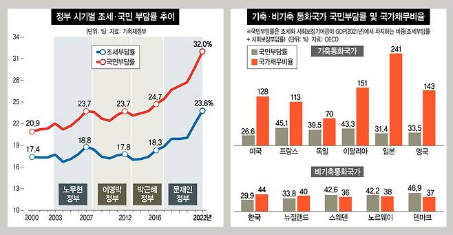 2023년 말 한국은 전체 인구에서 65살 이상이 차지하는 비율이 19%로 초고령사회 기준인 20%가 되기까지는 이제 겨우 1%포인트만 남았다. 경제협력개발기구(OECD) 국가의 재정 규모가 많게는 국내총생산(GDP)의 50% 수준에 이르게 된 경우가 많은데(스웨덴, 프랑스 등) 이들 국가는 복지에 대한 지출 비중을 지속적으로 증가시켜오면서 재정 규모가 커진 것이다. 또한 복지 지출에 대한 재원 조달을 상당 부문 조세수입으로 해오는 과정에서 조세부담률(국민부담률)이 증가해왔다. 우리는 이제 국가채무 비율을 늘릴 것이냐 조세부담률을 늘릴 것이냐의 선택의 시점이 다가온다는 것을 알아야 한다.