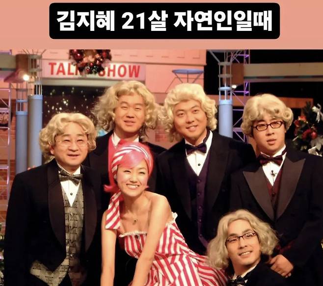 공개된 사진 속에는 21살 때 동료 개그맨들과 함께 사진을 찍는 김지혜의 모습이 담겼다. 염경환, 지상렬, 김한석 등의 개그맨들과 함께 가발을 쓴 김지혜는 환하게 미소 짓고 있는 모습.