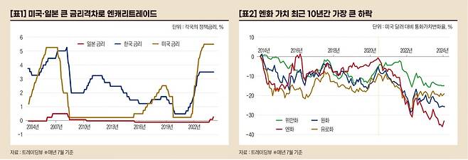그간 엔화 약세의 직접적인 원인은 미국과 일본의 금리차이를 활용한 ‘엔캐리트레이드’이다. [표1]에서와 같이 7월 현재 미국의 기준금리는 5.5%, 일본은 0.25%이다. 일본 투자자의 입장에서는 저금리인 엔화로 차입하여 미국 단기국채에 투자한다면 5.25%의 이익을 얻을 수 있는 것이다.