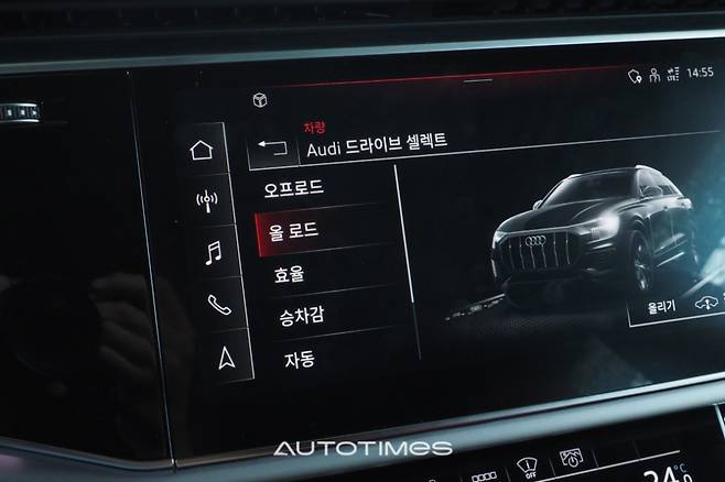 아우디 드라이브 셀렉트는 크게 오프로드와 올로드, 효율, 승차감, 자동으로 세분화 되어 있다. 이와 함께 차고를 오르내릴 수 있는 서스펜션 버튼도 별도로 설정 가능하다. 각 모드별 차이가 크지는 않은 편이다. 대부분의 노면 상황에서는 올로드 만으로도 충분히 커버 가능하며 험로 주행을 앞두고 있는 경우에만 오프로드를 활용하면 될 듯하다. 드라이빙을 좋아하는 사람이라면 조금 아쉬울 수 있지만 그만큼 평균값을 잘 맞추고 호불호 없이 안정적인 성격을 가졌다는 뜻으로 해석 가능하다.