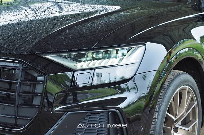 앞모습은 전형적인 아우디다. 면적이 상당한 팔각형 싱글프레임 그릴과 각을 살린 범퍼 디자인 등이 매력적이다. 주행에 도움을 주는 각종 센서는 아우디 로고를 중심으로 양쪽에 위치한다. 기존 대비 높은 곳에 달려있어 보다 정확한 인식이 가능하다. 날카로운 헤드램프는 크기가 상당하고 메트릭스 LED 타입을 적용해 기능적으로도 완벽하다. 램프 전용 워셔액 분사장치와 함께 테두리를 검게 칠해 차체 컬러와 통일감도 보여준다.