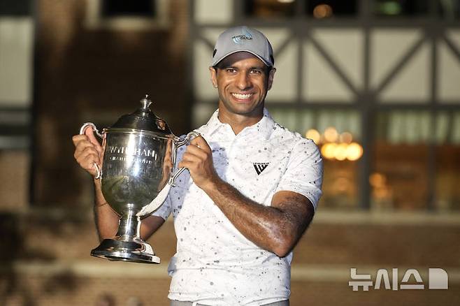 [그린즈버러=AP/뉴시스] 애런 라이(영국)가 11일(현지시각) 미 노스캐롤라이나주 그린즈버러의 세지필드CC)에서 열린 미국프로골프(PGA) 투어 정규시즌 마지막 대회 윈덤 챔피언십 정상에 올라 트로피를 들고 포즈를 취하고 있다. 라이는 최종 합계 18언더파 262타로 우승하며 생애 첫 PGA 투어 정상에 올랐다. 2024.08.12.