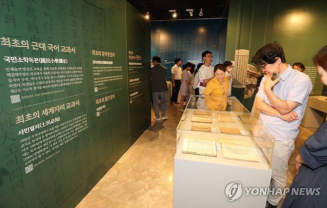 (세종=연합뉴스) 배재만 기자 = 12일 오후 세종시 국립세종도서관에서 열린 근현대 인쇄출판을 주제로 한 기획전시 '깁더: 우리책, 깁고 더하다' 전시 개막행사에서 참가자들이 전시물을 살펴보고 있다. 이번 전시는 조선 후기부터 해방기까지의 초판본과 근대 시기 독자들이 열광했던 베스트셀러 문인들과 화가들의 열정이 담긴 예술적 책 장정과 표지 그림 등 총 140여 점의 유물로 우리책의 역사와 가치를 살펴보는 특별한 전시다. 2024.8.12
