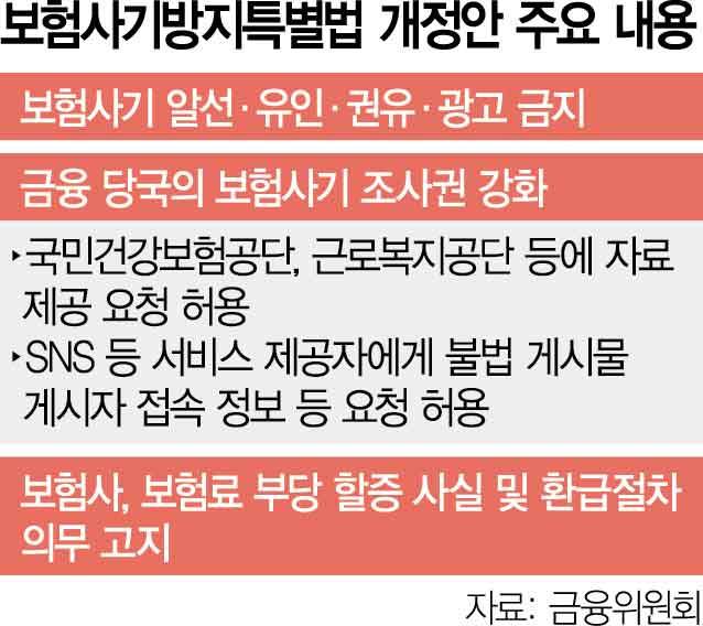 금융 당국도 보험사기 행위 조사를 위해 국민건강보험공단·근로복지공단 등 관계기관에 필요한 자료의 제공을 요청할 수 있게 됐다. 인터넷 포털사이트나 소셜네트워크서비스(SNS) 등 정보통신서비스 제공자에게도 불법 게시물 게시자의 접속 정보 등 관련 자료 요청도 가능하다.