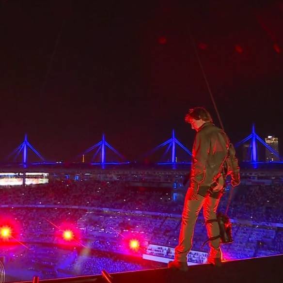폐막식 말미 파리올림픽 조직위원장과 IOC 위원장 연설이 끝난 후, 올림픽기 이양식이 진행됐습니다. 캐런 배스 LA 시장이 깃발을 받아 들자 H.E.R.이 부르는 미국 국가가 식장을 가득 메웠어요. 그리고 톰 크루즈가 공중에서 모습을 드러냈습니다. 스타드 드 프랑스 꼭대기에서 로프 하나에 몸을 맡긴 채 말이죠.