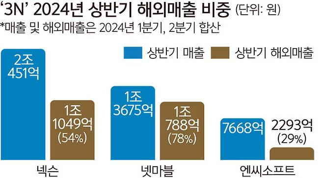 우리나라 대표 게임사인 '3N(넥슨·넷마블·엔씨소프트)'이 올 상반기 매출 중 절반 이상을 해외에서 벌어들인 것으로 나타났다.