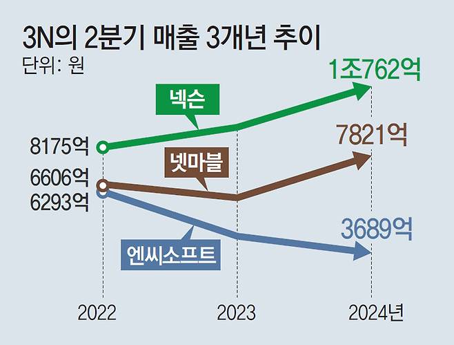 넥슨·넷마블과 달리 해외 매출 비중이 낮은 엔씨소프트는 간신히 적자만 면했다. 엔씨의 2분기 매출은 3689억 원으로 전년 동기보다 16% 줄었다. 영업이익은 88억 원으로 75% 감소했다. 엔씨는 해외 진출을 늘려 저조했던 실적을 만회한다는 계획이다. 엔씨는 28일 신작 스위칭 역할수행게임(RPG) ‘호연’의 한국·일본·대만 출시를 시작으로 ‘리니지2M’의 동남아 서비스를 준비 중이다. 최근 베트남 IT기업 VNG와 합작법인을 설립하기도 했다.