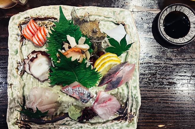 이곳은 다이묘 거리에 위치한 해산물 이자카야다. 이곳은 추천하는 주문 순서가 있다. 우선 '사시미 모리아와세(한 접시에 여러 가지 재료를 늘어놓은 것, 모둠)'와 사케로 시작하는 것을 추천한다. 사시미는 전부 숙성회다. 해동지에 돌돌 말려 있는 재료는 짧게는 30분, 길게는 몇 시간 동안 숙성 과정을 거친 생선들이다. 광어, 참돔, 방어, 연어, 문어, 삼치, 뿔소라가 담겨 나온다.