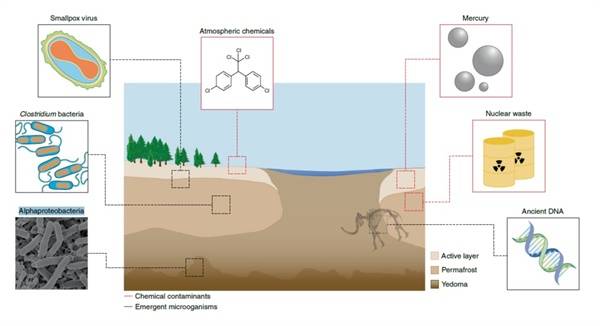 유럽우주기구(ESA)가 미국항공우주국(NASA)과 공동으로 연구해 2021년 발표한 '북극 영구동토층 파괴로 인한 생화학적 위험' 보고서[1]는 북극의 영구동토층이 빠르게 녹으면 고대 바이러스 외에 항생제 내성 세균, 핵 폐기물의 방사능, 기타 우려되는 화학 물질이 방출될 가능성이 있다는 사실을 확인했다. [2]